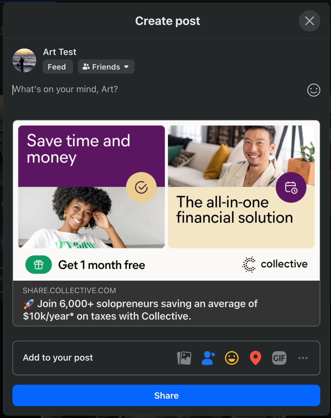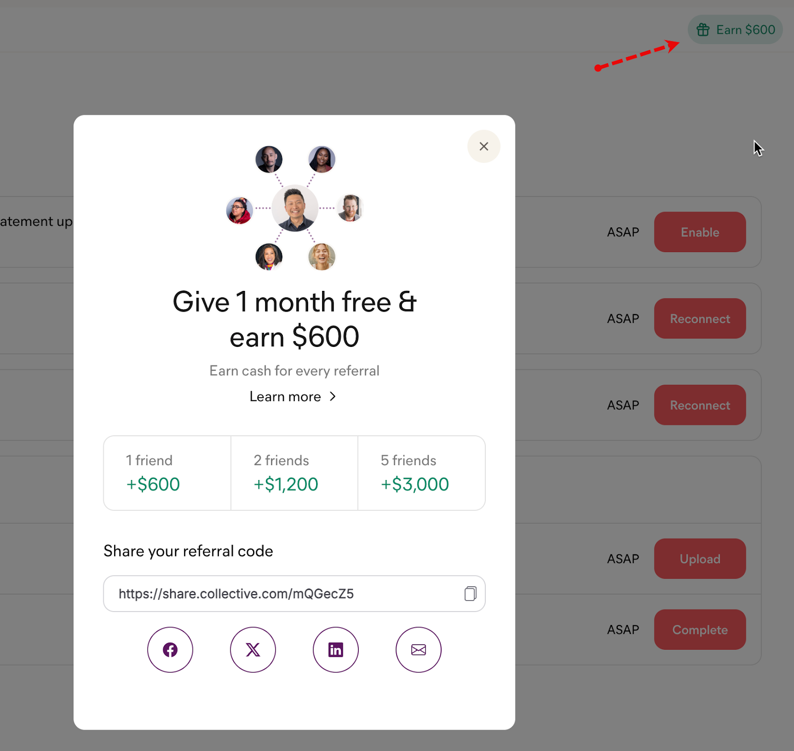 The Collective Referral Program rewards you for introducing other solopreneurs to Collective. You earn $600 for every qualified S Corp referral and $300 for every qualified LLC referral, and your friends receive one month of membership free.