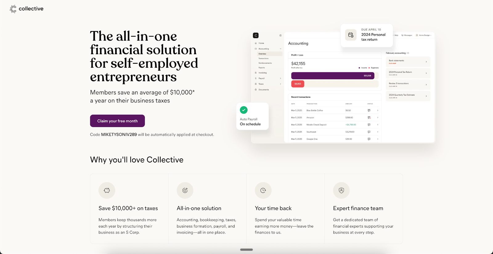 - Using search terms ‘Collective promo code’, ‘Collective discount code’,‘Collective coupon code’, ‘Collective tax reviews’, and ‘Collective s corp review’ in the title, URL, and meta description of website pages, without prior approval.