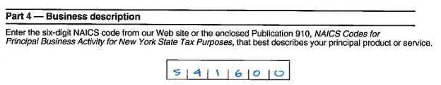 4. Enter your six digit NAICS code. NAICS codes are six-digit codes used to classify businesses according to their economic activity. You can find more information about NAICS codes from the state’s Publication 910 here: Publication 910, NAICS Codes for Principal Business Activity for New York State Tax Purposes
