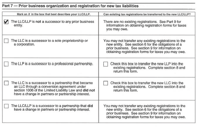 6. Proceed to Part 7. Check the first box “The LLC/LLP is not a successor to any prior business entity,” (as long as this is true) and proceed to Part 9 of the form (part 8 should be left blank).