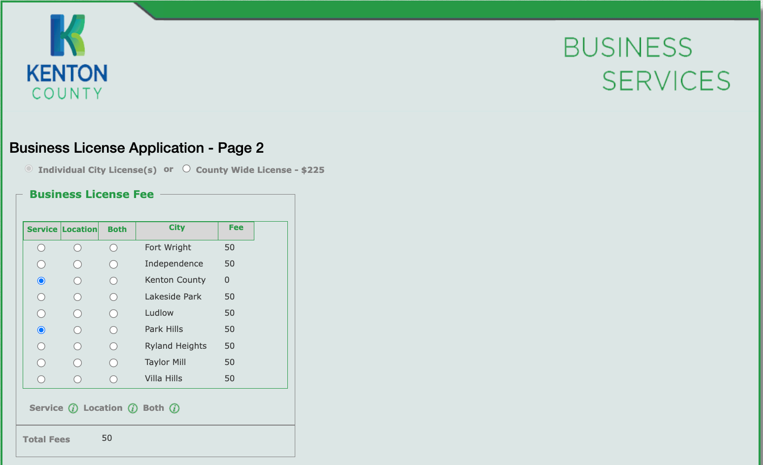 Under "Business License Fee", you'll notice that the "Kenton County" option is already selected with $0.00 fee but you also need to select your City of residence. Once you select that, it will show you the total fee that you need to pay for your license.