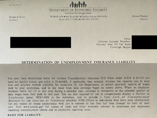 The second one is from the Arizona Department of Economic Security with your Unemployment Account ID. This is important as it is needed to file reports and pay taxes for your LLC. Once you receive this letter, please upload it to your Collective documents with the document type “Employer Registration Documents” and et our team know, so we can add it to your payroll records.